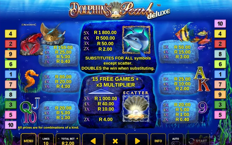 Dive into the underwater world with Dolphins Pearl Deluxe, an aquatic journey designed to capture the essence of marine life and the excitement of exploring legendary treasures. This fascinating slot was brought to life by the creative intelligent minds at novomatic and was loved by players since the release in 2007. The action takes place on a familiar 5×3 reel setting, allowing you to match combinations across the 10 paylines. Due to the medium volatility, the gameplay is designed to offer incredible rewards on a much frequent interval. To trigger a payout, you need to land sequences of the same symbol across the paylines. Rewards are awarded for landing a sequence of three or more of the same symbols on adjacent reels, starting from the leftmost to right. The more winning sequences you trigger, the closer you reach the max reward. By activating the game’s bonus features, you can possibly unlock the game’s unique bonuses and claim up to 4638x your stake.